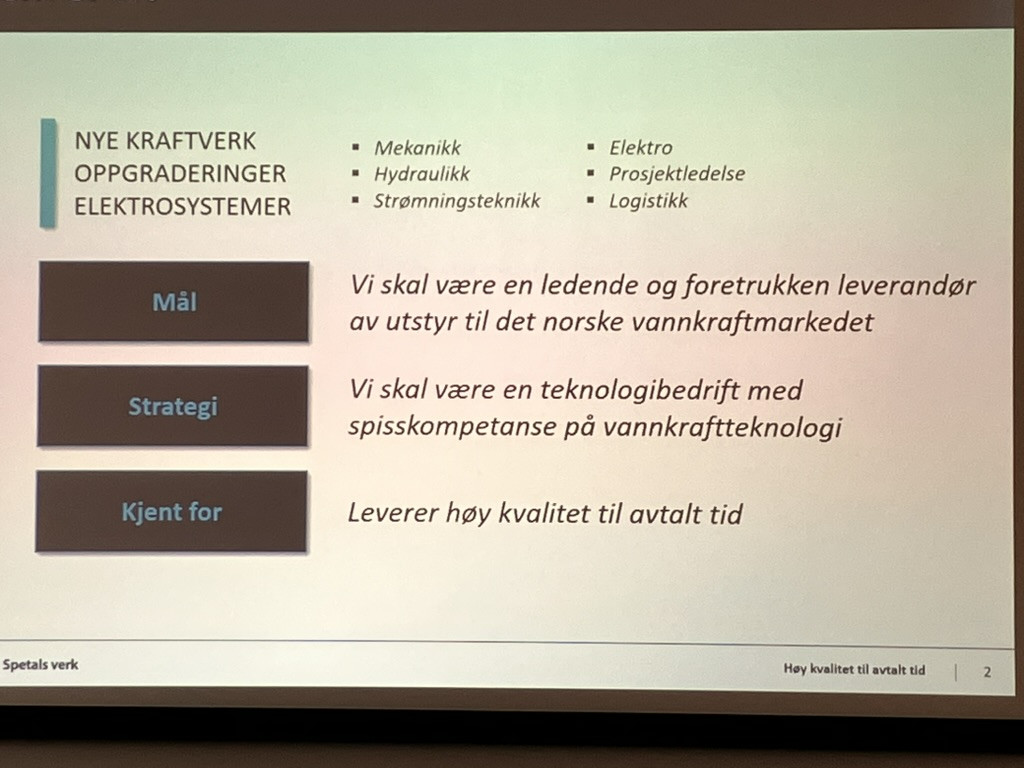 Magnus Jonassen ga en meget god og konsis innføring i hva Spetals verk arbeider med. Som nevnt ovenfor, leverer de turbiner, generatorer, hydrzulikk, styringssystemer og elektrotavler til vannkraftindustrien. De har vokst fra starten i 1999 til 26 ansatte og har en markedsandel på 30-40% i 2025. De har underleverandører i flere land, bl.a. Bulgaria, Tsjekkia, Sverige og Tyskland. De leverer både nye vannkraftverk, og oppgraderer gamle.